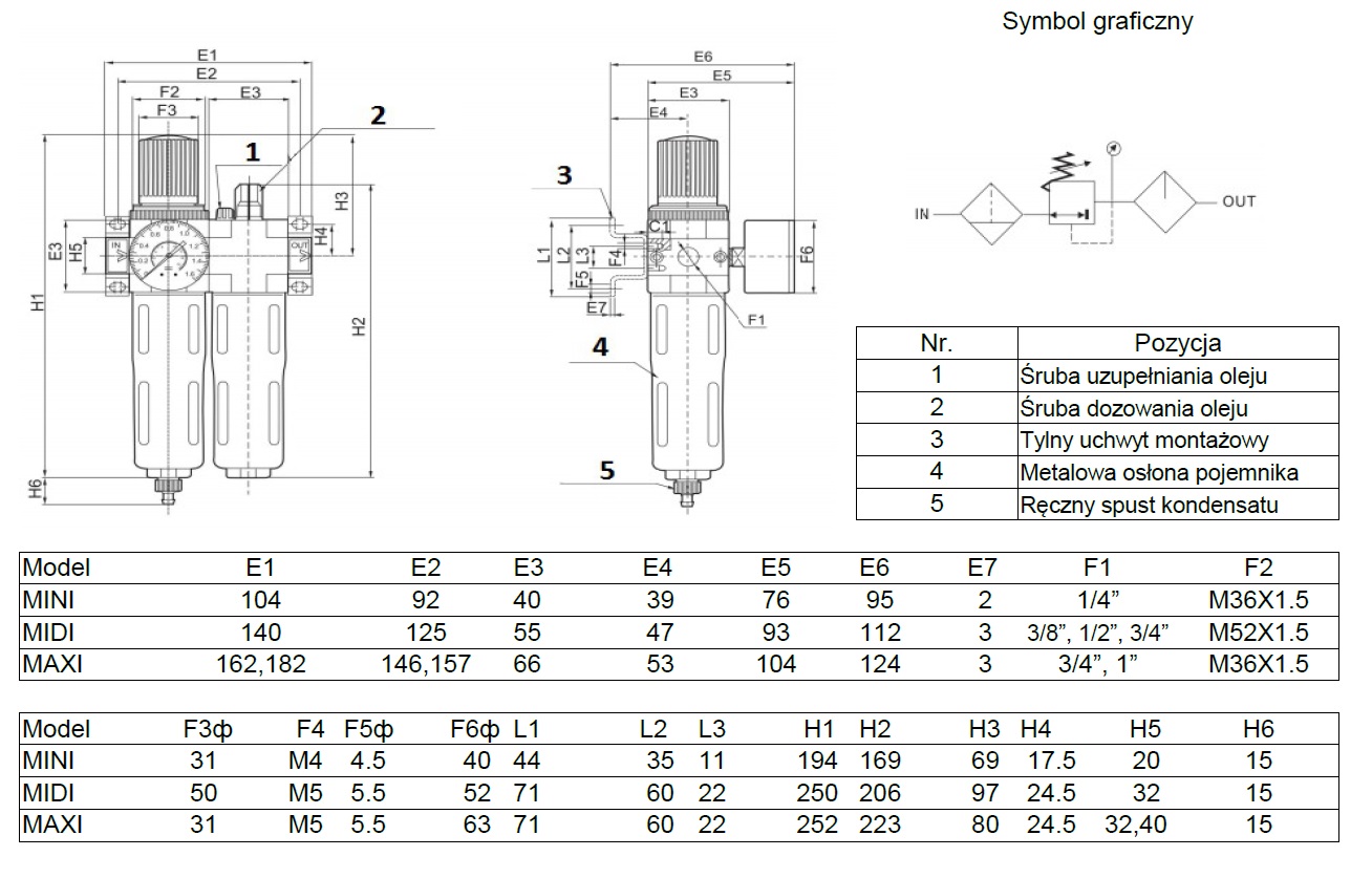 - Charakterystyka budowy: filtr ze spieku z separatorem wody; tłok regulujący; membranowy typ regulatora, regulator dozowania oleju.