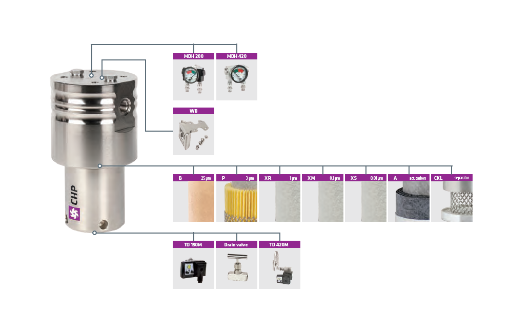 Filtry CHP ze stali węglowej są przeznaczone do wydajnego usuwania cząstek stałych, wody, skroplin oleju, węglowodorów i zapachów z systemów sprężonego powietrza. Aby osiągnąć wymaganą jakość sprężonego powietrza należy zainstalować właściwy element filtracyjny (B, P, R, M, S, A) w obudowie filtra.