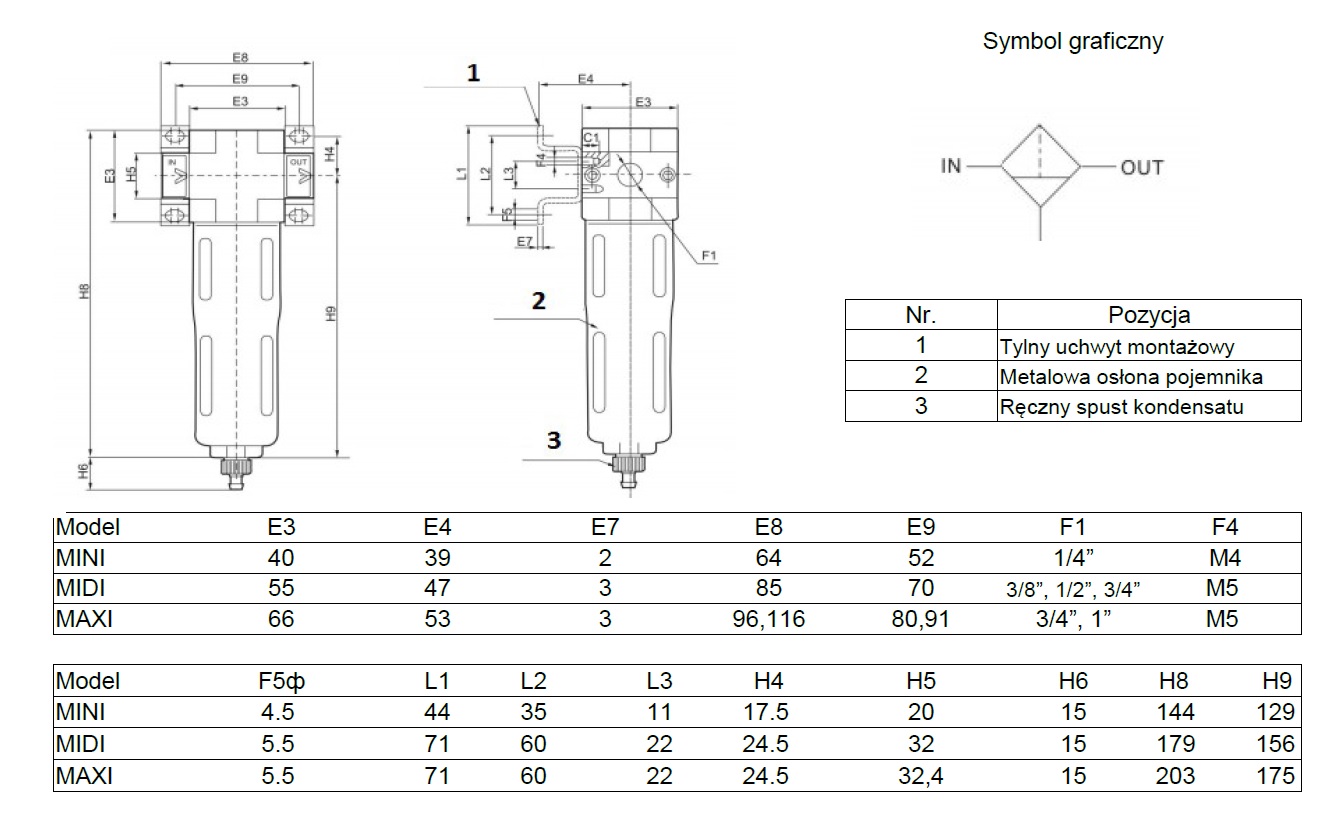 Filtr ma za zadanie oczyszczać sprężone powietrze z zanieczyszczeń stałych i płynnych o wielkościach według założonego filtra. W dolnym pojemniku osadza się kondensat, usuwamy go ręcznie.