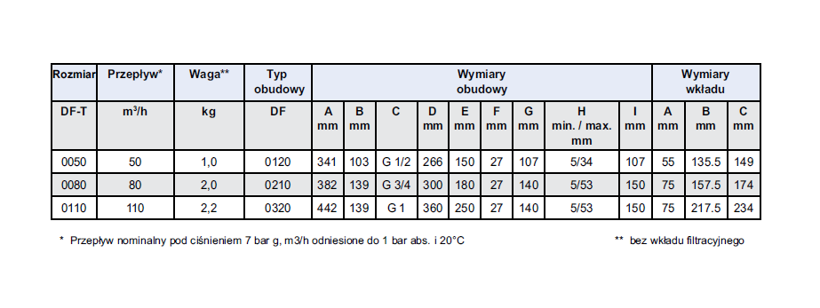 3 rozmiary filtra DF-T pokrywają zakresem wydajności przepływy do 110 Nm³/h w warunkach ciśnienia roboczego 7 bar.