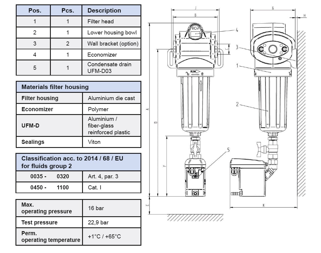 Filtr wstępny 1um, przyłącze: 1/2″, przepływ: 1,16m3/min, wersja:Superplus z automatycznym spustem kondensatu UFM-D,cyfrowy wskaźnik zapełnienia filtra typu Ekonomizer