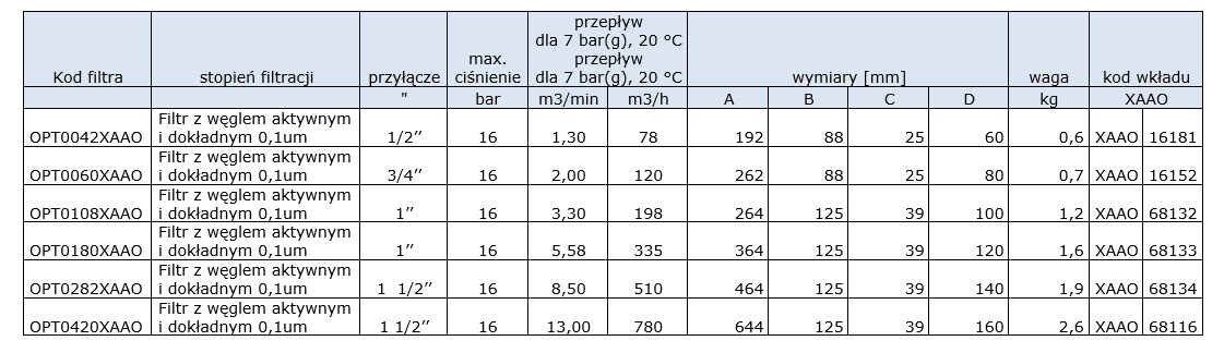 Filtr z węglem aktywnym, filtr dokładny 0,1um, przyłącze: 1/2’’, ciśnienie max. 16bar, przepływ: 1,30m3/min
