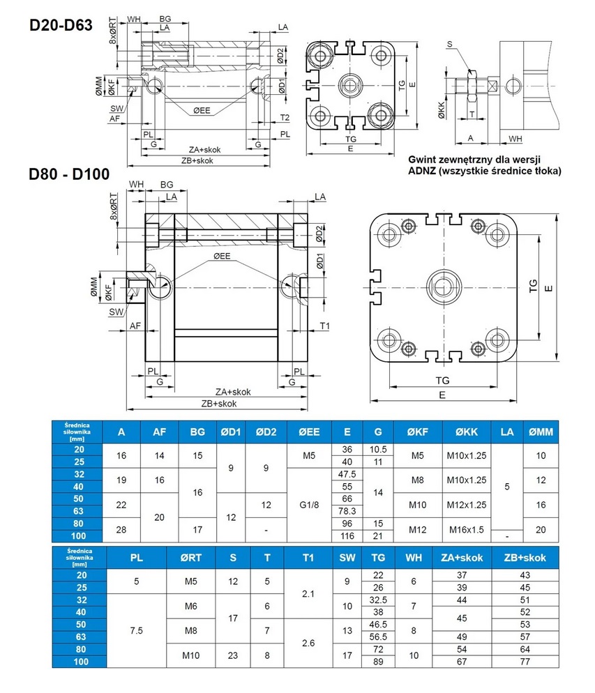 Siłowniki kompaktowe serii 21287.025.0010.ADNZ dwustronnego działania z gwintem zewnętrznym na tłoczysku zgodne z ISO 21287 posiadają zabudowany magnes w tłoku i są przystosowane do stosowania bezdotykowych czujników położenia tłoka.