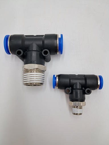 Trójniki wtykowe T z gwintem są elementami złącznymi do stosowania w pneumatycznych układach napędowych i sterujących. Służą do montażu przewodów pneumatycznych elastycznych wykonanych z poliuretanu PU, PUN, Polietylenu PE lub Poliamidu PA. Dzięki trójnikom wtykowym T z gwintem można łączyć w układzie przewody o średnicach zewnętrznych od 4mm do 12mm. Zakres gwintów w trójnikach wtykowych T z gwintem obejmuje średnice od G1/8” do G1/2”.